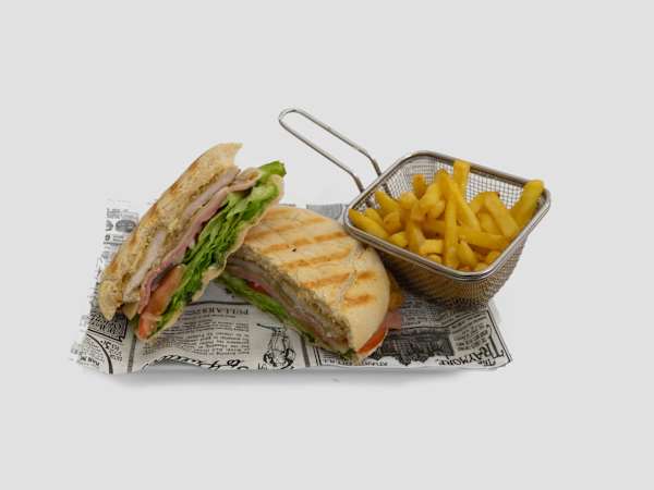 Pan campero, salsa de tomate, lechuga, tomate natural, ali-oli, cebolla, huevo y escalope de pollo empanado