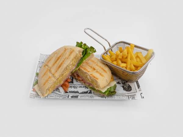 Pan campero, lechuga, salsa de tomate, mahonesa, cebolla, jamón york, queso edam y tortilla de patatas