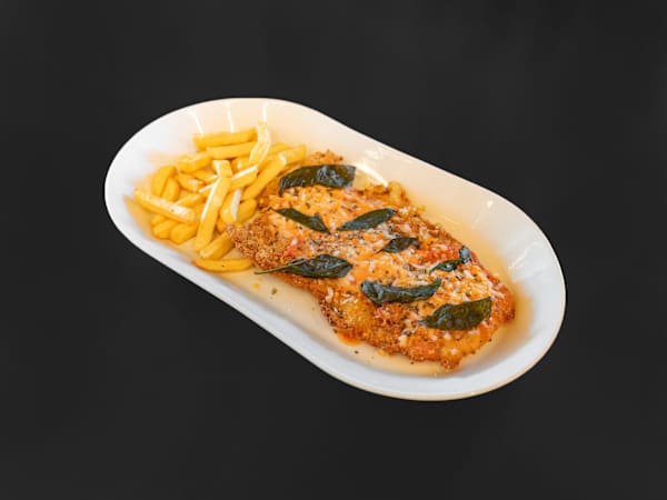 Escalope empanado, salsa de tomate casera, albahaca fresca y queso rallado fundido, acompañado de patatas fritas